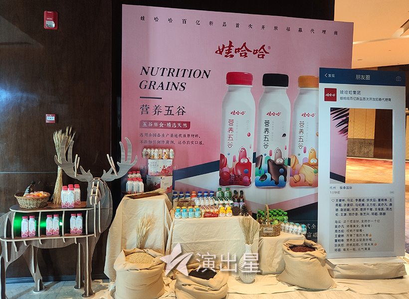 本次娃哈哈营养五谷新品发布会由演出星提供整场与现场执行服务。演出星是互联网活动一站式服务平台,主营业务为企业、组织提供活动策划及现场执行的服务。演出星是专业的活动策划公司、会展公司、会务公司、公关公司,活动经验丰富,拥有全国各地的落地执行能力。