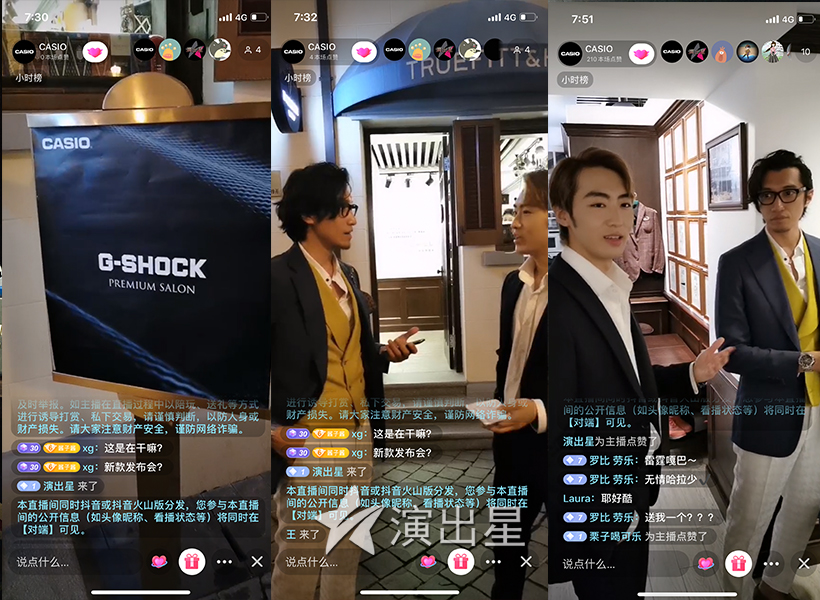 本次卡西欧G-Shock线上直播由演出星提供整场与现场执行服务。演出星是互联网活动一站式服务平台,主营业务为企业、组织提供活动策划及现场执行的服务。演出星是专业的活动策划公司、会展公司、会务公司、公关公司,活动经验丰富,拥有全国各地的落地执行能力。